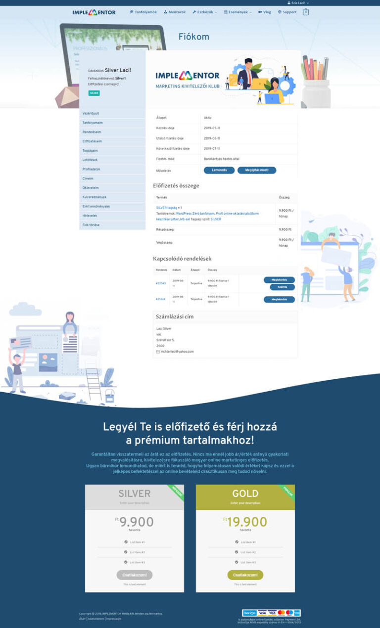 A profi előfizetéses rendszer számomra azt jelenti, hogy nem csak technikailag és funkcionalitásban működőképes, de grafikailag vagyis a dizájnon is látszik, hogy igényes. Az egész oldal ki van dolgozva a külső felülettől kezdve a háttér oldalakon keresztül a tagsági oldal minden apró részletéig. Nem láthatók az oldalon azok az ordító jelek, amiken látszik, hogy amatőrök hegesztették össze… Nálam így néz ki például egy vezérlőpult, ami egy sima Woocommerce fiók oldal csak “kicsit” nagyon át kellett szabnom, hogy olyan legyen, amilyet szeretnék…